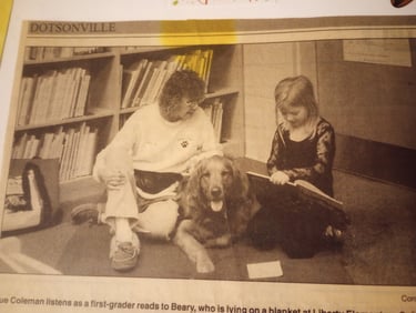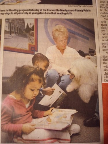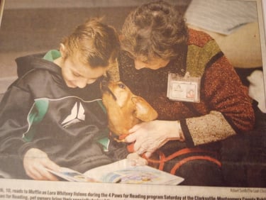 Falkinburg’s Golden Genesis, or Genni, and Handler Lori have been a Therapy Team since 2015. They visit the local hospital, assisted living facilities, VBS, and various facilities in Clarksville. Genni enjoys going to Lori’s school to visit the students, as well as participating in the "Read With Me" Program at the Public Library. Genni loves meeting new people and putting a smile on their faces!